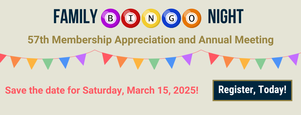 Family Bingo Night: 57th Membership Appreciation and Annual Meeting - Save the date for Saturday, March 15, 2025. Register, Today!
