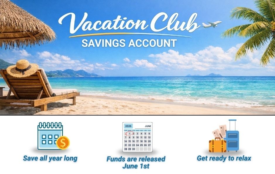 The Vacation Club Savings Account is designed to help you save for travel and getaways throughout the year. By setting aside a portion of your paycheck regularly, you can build your vacation fund automatically. On June 1 of each year, your accumulated savings are transferred into your checking account, making your money available just in time for vacation season.